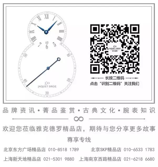 雅克德罗(Jaquet Droz)的大秒针系列,源自创始人皮埃尔·雅克·德罗(Pierre Jaquet-Droz )1784年创的一款怀表作品,表盘中的大秒针设计与8字型布局,至今仍是钟表领域中最具标志性的元素和极简前卫风格的代表。大秒针系列中采用象牙白色大明火珐琅表盘的一类作品,则因为更加趋向于皮埃尔·雅克·德罗的原作风格而备受赞誉。