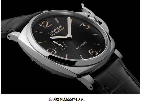 PAM00674经抛光打磨的金属以及缎面太阳放射饰纹表盘均突显出优雅稳重的气质。表盘设计采用三明治式结构,设有棒状时标及数字显示,加上设于9点钟位置的小秒盘,风格简约,将沛纳海的风格演绎出来。