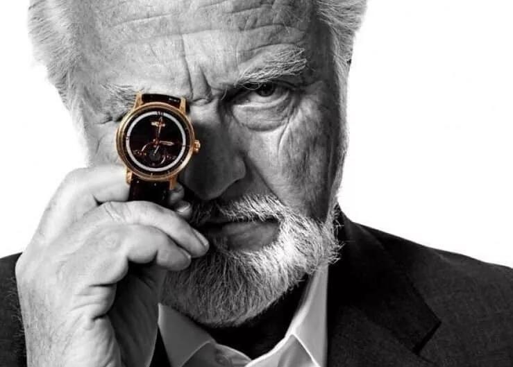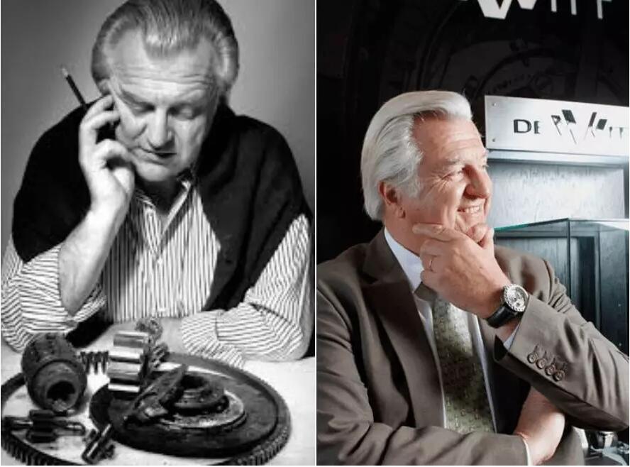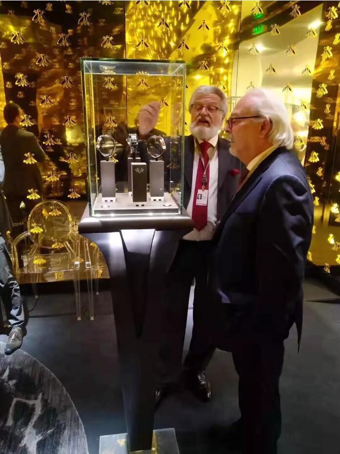 钟表巨匠Philippe Dufour大师和DEWITT(帝威)创始人Jerome de Witt先生一起在2019 SIHH上的DEWITT精美展台前欣赏最新腕表